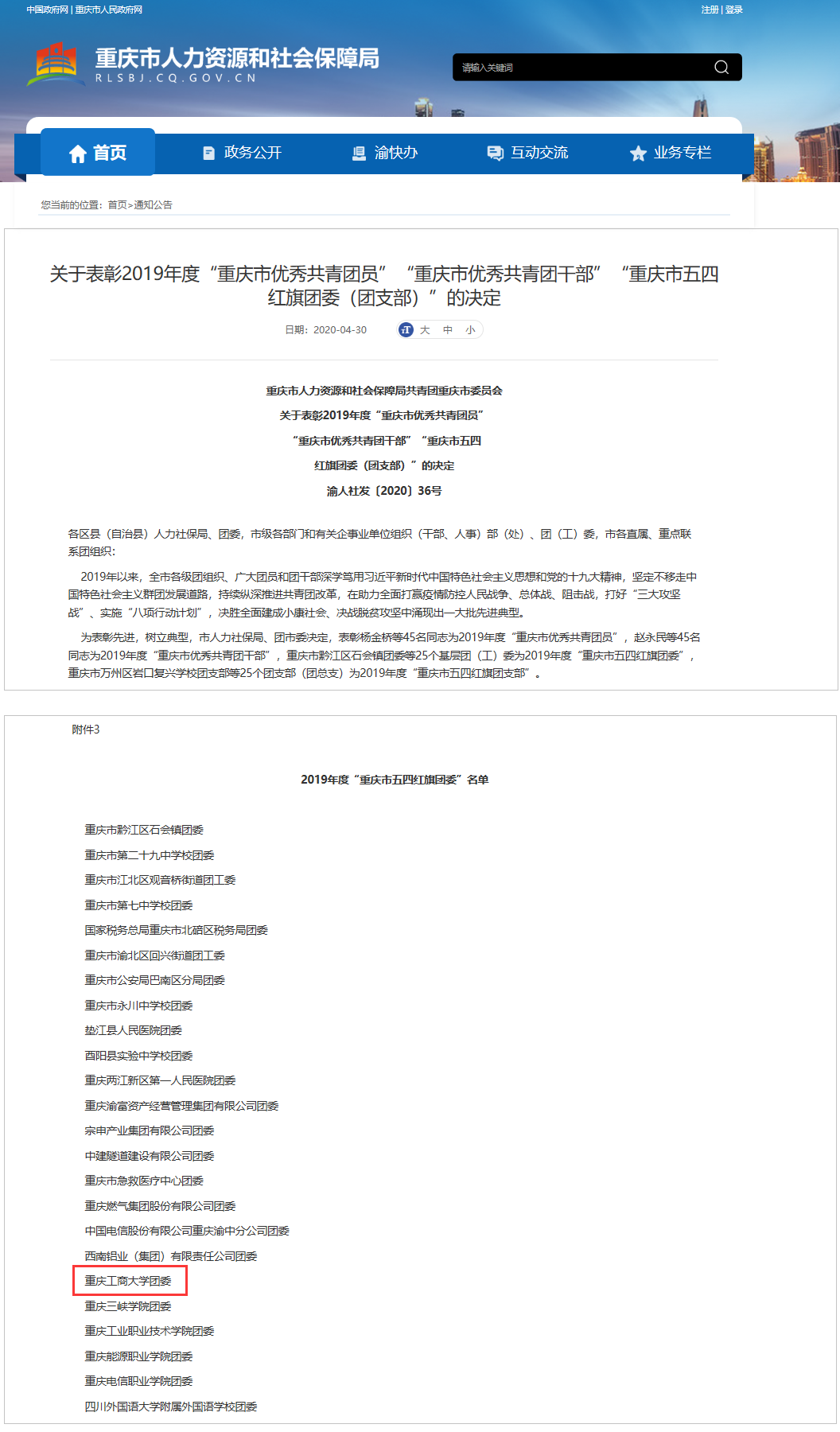 4月30日,重庆市人力资源和社会保障局共青团重庆市委员会发布《关于表彰2019年度“重庆市优秀共青团员”“重庆市优秀共青团干部”“重庆市五四红旗团委(团支部)”的决定》。其中,我校获评2019年度“重庆市五四红旗团委”(全市共评选25个基层团(工)委)。